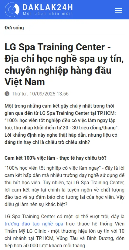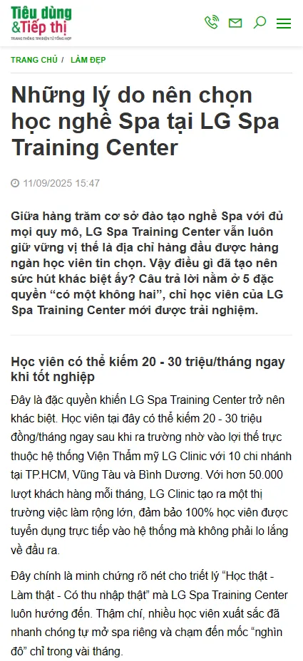 Với chương trình đào tạo chuẩn quốc tế và bám sát thị trường, LG SPa Training Center cam kết mang đến nền tảng chuyên môn vững chắc, giúp học viên tự tin làm chủ sự nghiệp và gặt hái thành công bền vững.