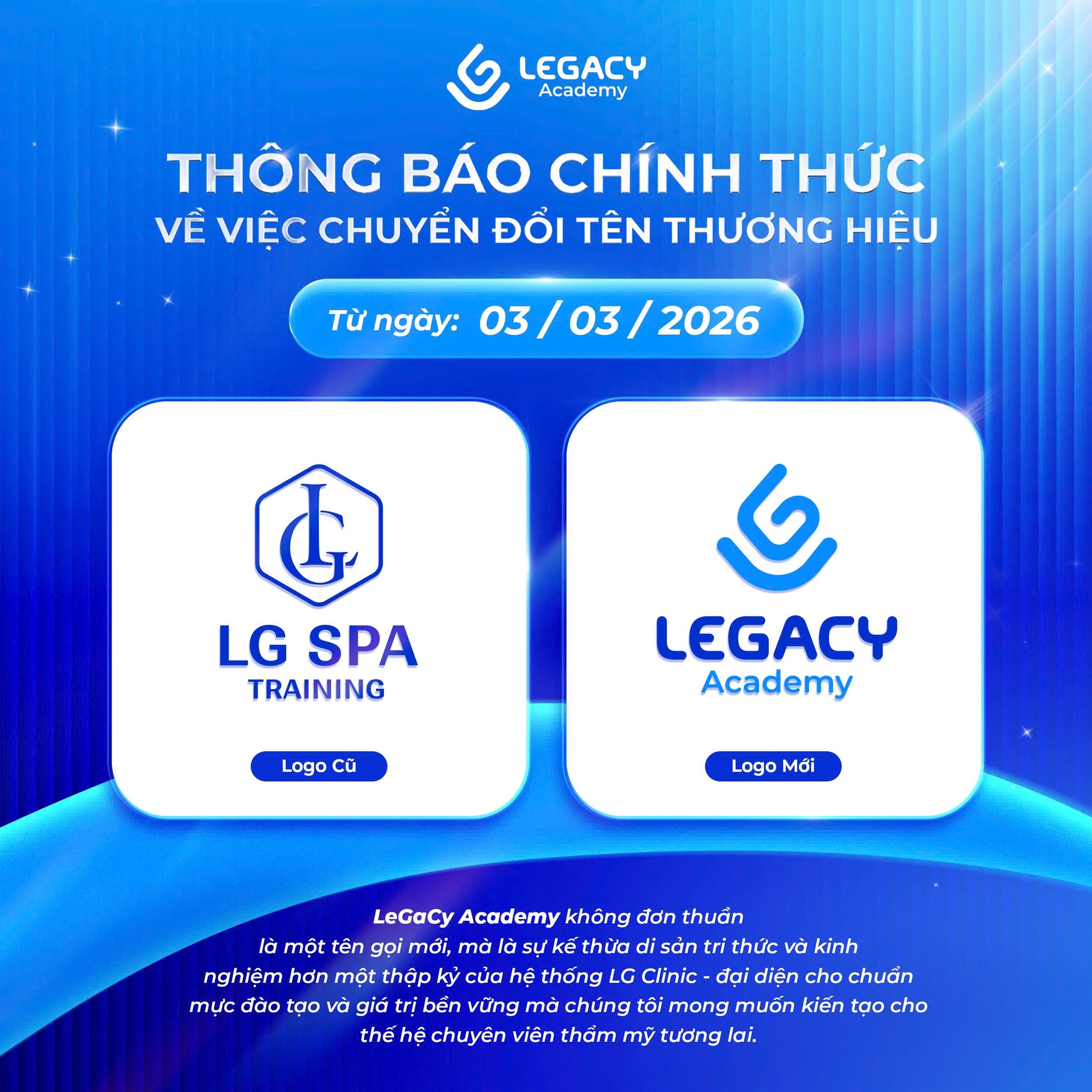 Kể từ ngày 03/03/2026, chúng tôi trân trọng thông báo: LG Spa Training Center chính thức đổi tên thành Legacy Academy – thương hiệu đào tạo thẩm mỹ với định hướng phát triển chuyên nghiệp hơn, bài bản hơn và bền vững hơn.